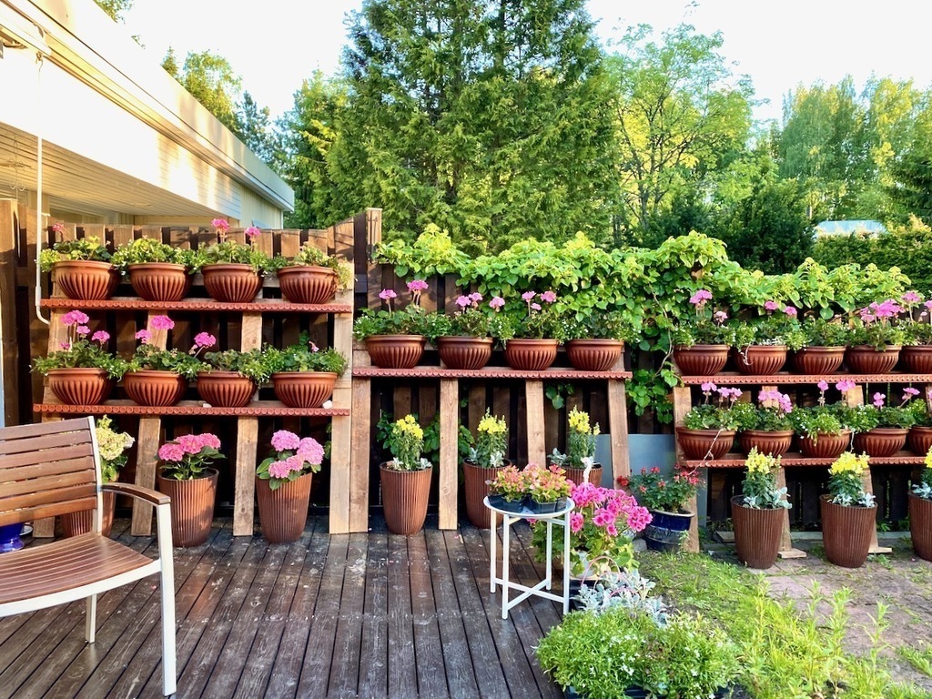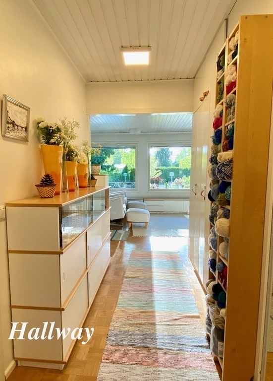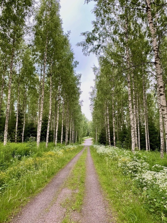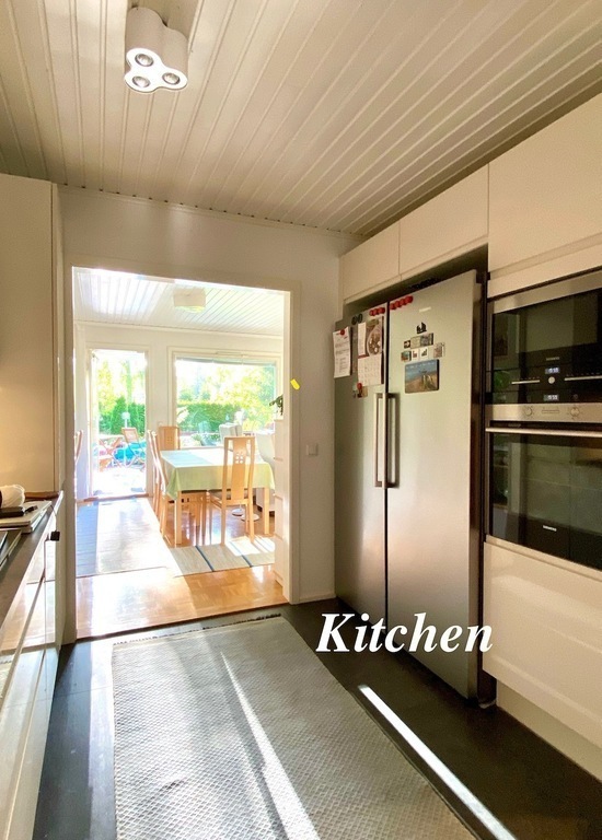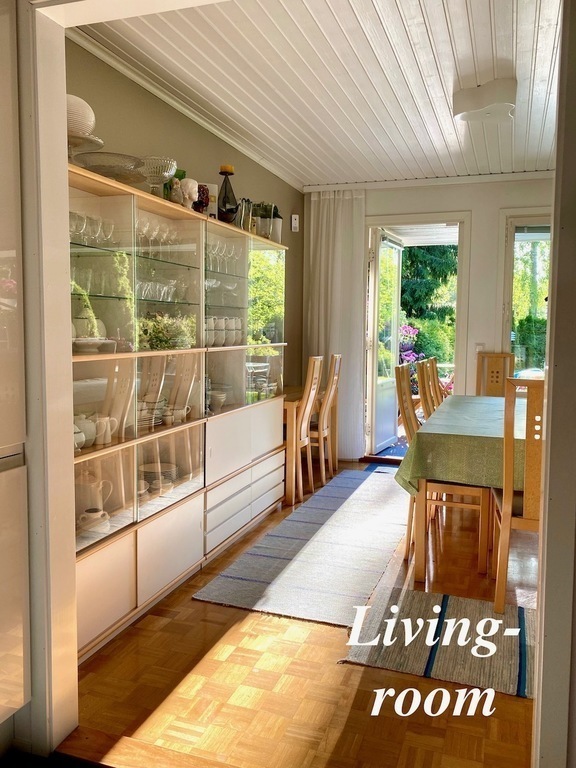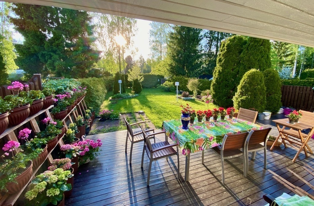 We live around 30 kilometers from the center of Helsinki in Tuusula in a row of six houses. The area is quiet and green. In the back we have a lovely courtyard and terrace facing west, where you can enjoy the sun from morning to evening. The sun rises very early and sets very late in June and July.