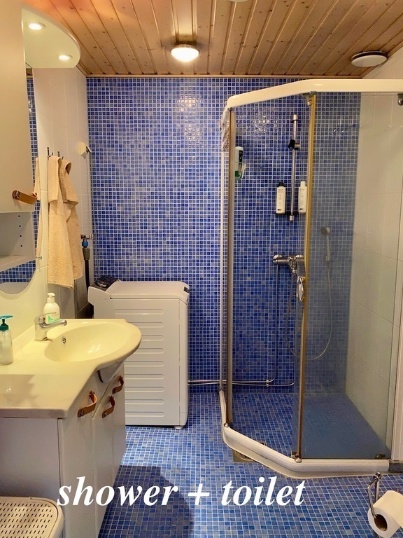 The kitchen is large and modern, all the rooms have plenty of light. There are two toilets and one shower. You can use the private sauna whenever you wish.