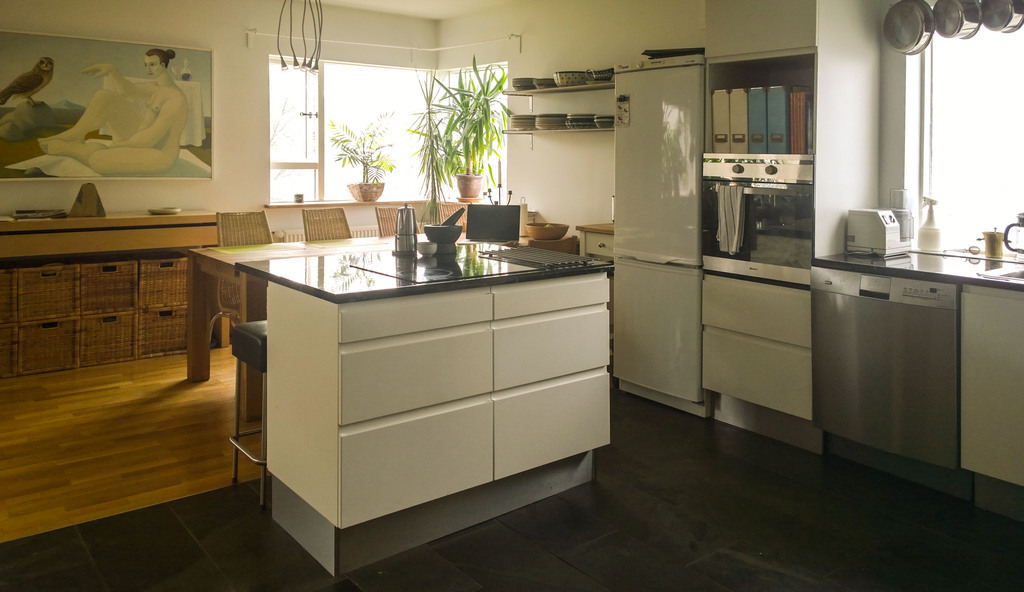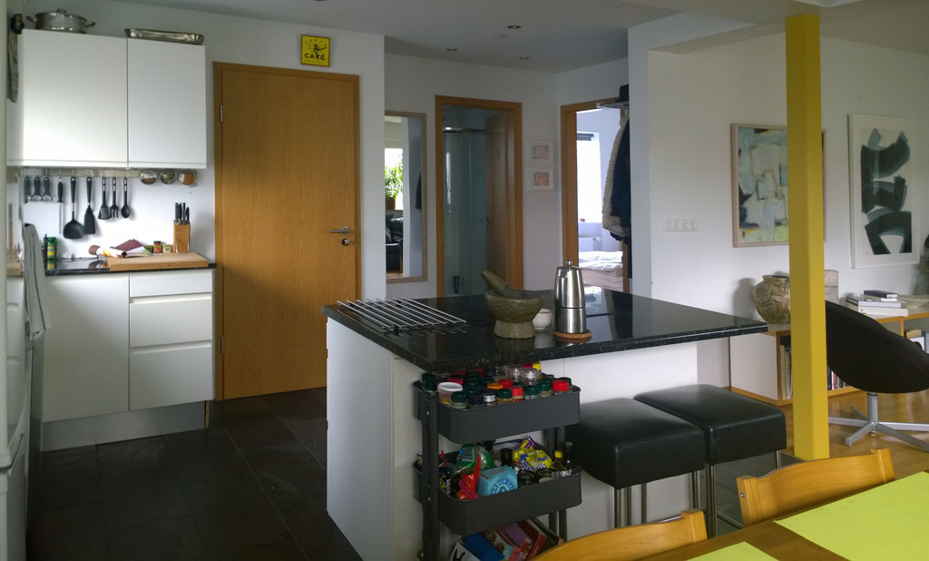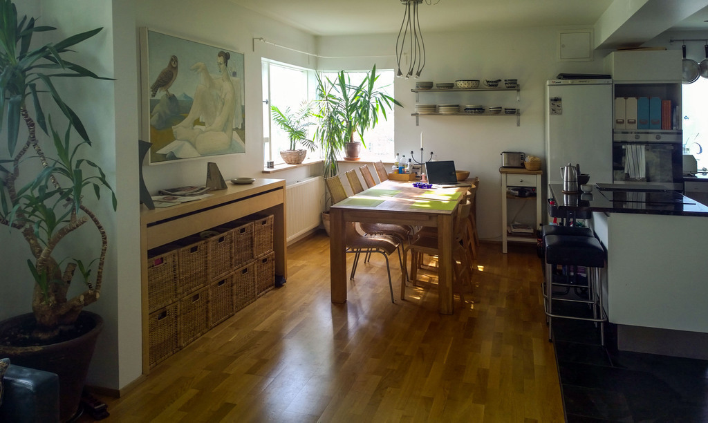 The apartment is in a four flat, two-floor house, built in 1948. Our home is 60 square meters with a bedroom, bathroom and an open space including kitchen, living room and dining room. Its bright and sunny – at the first floor. Washing machine is in the laundry room in the basement.