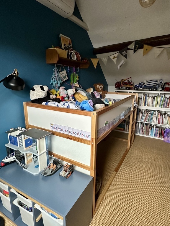 Titouan loves drawing on its own desk and playing with Playmobil's.