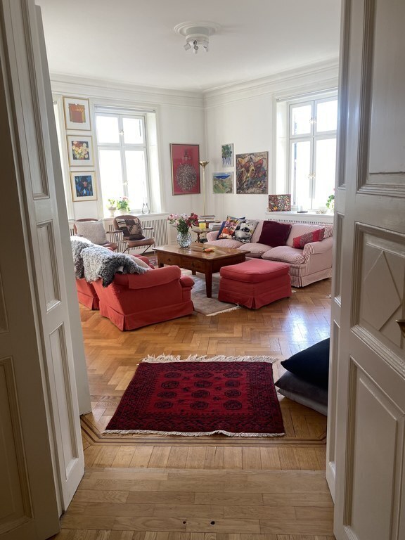 Our flat is on the fourth floor in a 120 year old house in the center of Stockholm. It is 160 m2, with two fireplaces and 3.20m (10.4ft) high ceiling. We have two bedrooms: one with two single beds (105x200 cm each) and one with a double bed (140x200 cm). Additionally, we have a single bed (90x200 cm) that can be placed in either bedroom if needed. We also have a backyard where you can relax and have a BBQ!
