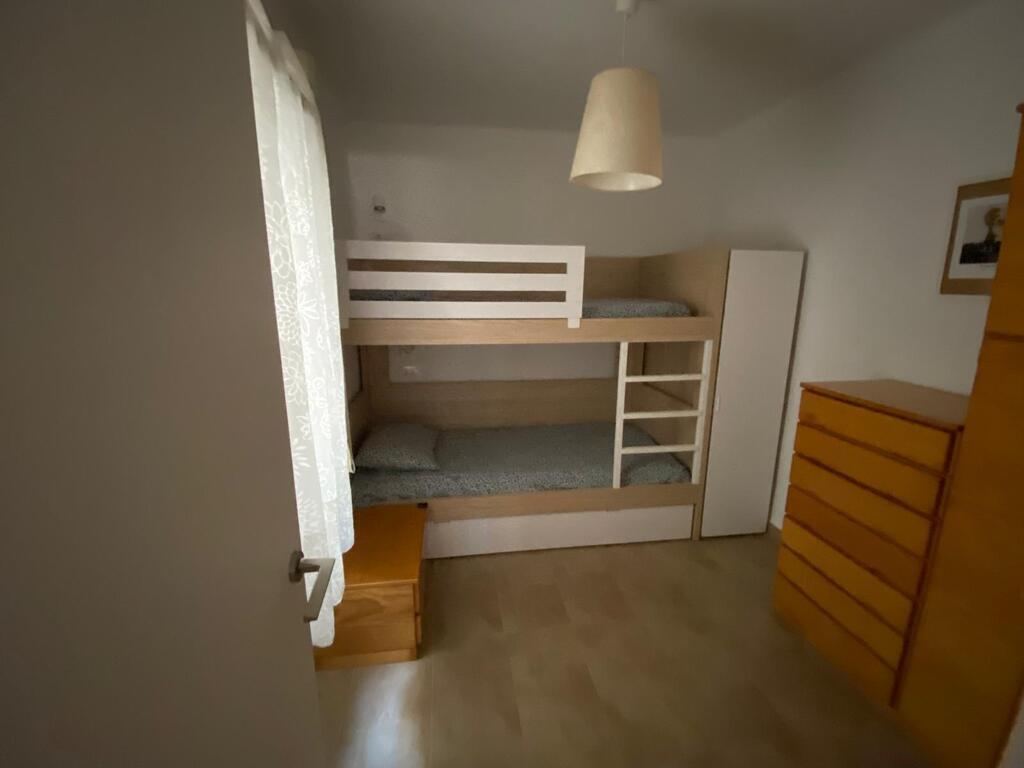 Apartamento de tres habitaciones (matrimonio, doble con dos camas e individual con litera y cama de arrastre), dos baños y cocina independiente. Terraza con vista lateral al mar. Ascensor y plaza de párquing cubierta. Muy tranquilo. Sol de tarde.